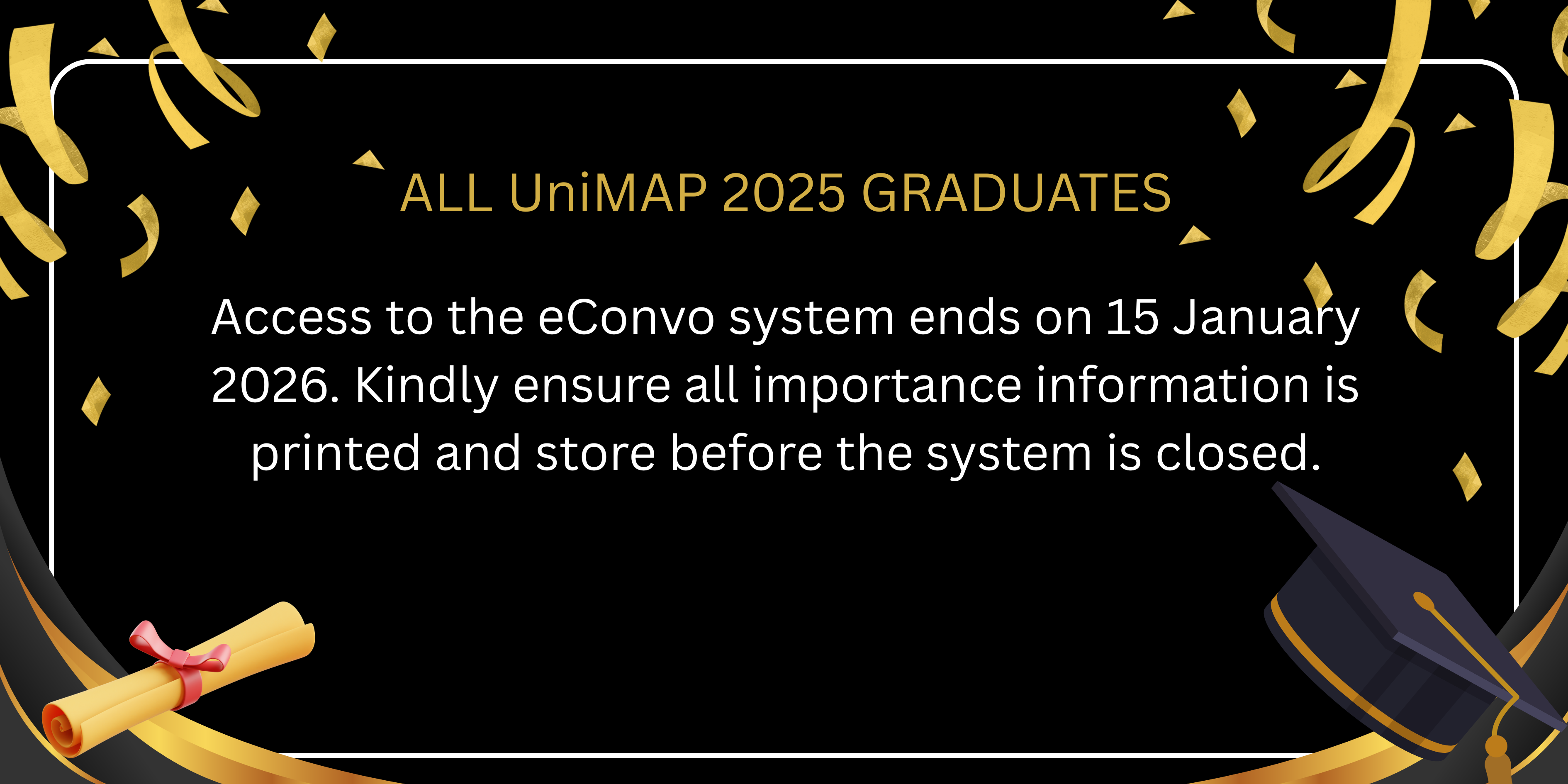 Academic Management Division (Graduation & Convocation) Academic Management Centre (AMC) Ground Floor, Chancellery Tuanku Syed Sirajuddin Universiti Malaysia Perlis (UniMAP) 02600, Arau Perlis, MALAYSIA Copyright © All Rights Reserved Academic Management Division (AMD) . Artwork Design by R.S.R (AMD) Latest Update :: Tue 18th Nov 2025, 10:15:25.s Convocation Hotline :: +60 1118742652
