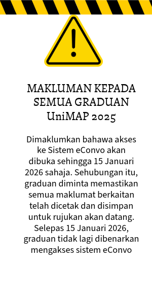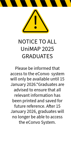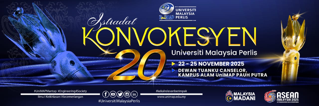 Academic Management Division (Graduation & Convocation) Academic Management Centre (AMC) Ground Floor, Chancellery Tuanku Syed Sirajuddin Universiti Malaysia Perlis (UniMAP) 02600, Arau Perlis, MALAYSIA Copyright © All Rights Reserved Academic Management Division (AMD) . Artwork Design by R.S.R (AMD) Latest Update :: Tue 18th Nov 2025, 10:15:25.s Convocation Hotline :: +60 1118742652